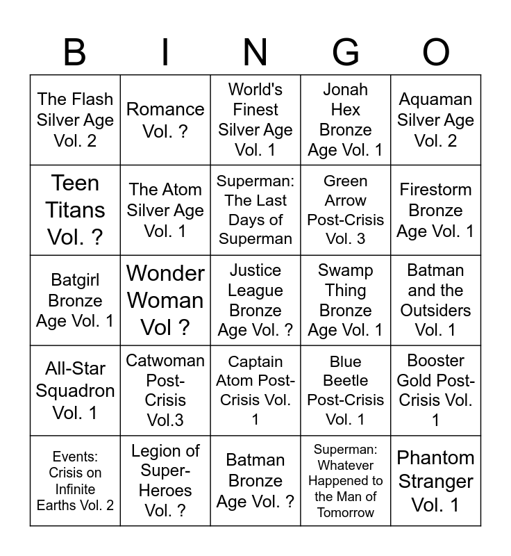 This bingo card has 25 words: Catwoman Post-Crisis Vol.3, Batman Bronze Age Vol. ?, Superman: The Last Days of Superman, Events: Crisis on Infinite Earths Vol. 2, Aquaman Silver Age Vol. 2, The Flash Silver Age Vol. 2, Teen Titans Vol. ?, Romance Vol. ?, Swamp Thing Bronze Age Vol. 1, Captain Atom Post-Crisis Vol. 1, Green Arrow Post-Crisis Vol. 3, Batgirl Bronze Age Vol. 1, Blue Beetle Post-Crisis Vol. 1, Booster Gold Post-Crisis Vol. 1, The Atom Silver Age Vol. 1, Phantom Stranger Vol. 1, Batman and the Outsiders Vol. 1, World's Finest Silver Age Vol. 1, Firestorm Bronze Age Vol. 1, Wonder Woman Vol ?, Justice League Bronze Age Vol. ?, Legion of Super-Heroes Vol. ?, All-Star Squadron Vol. 1, Jonah Hex Bronze Age Vol. 1 and Superman: Whatever Happened to the Man of Tomorrow.