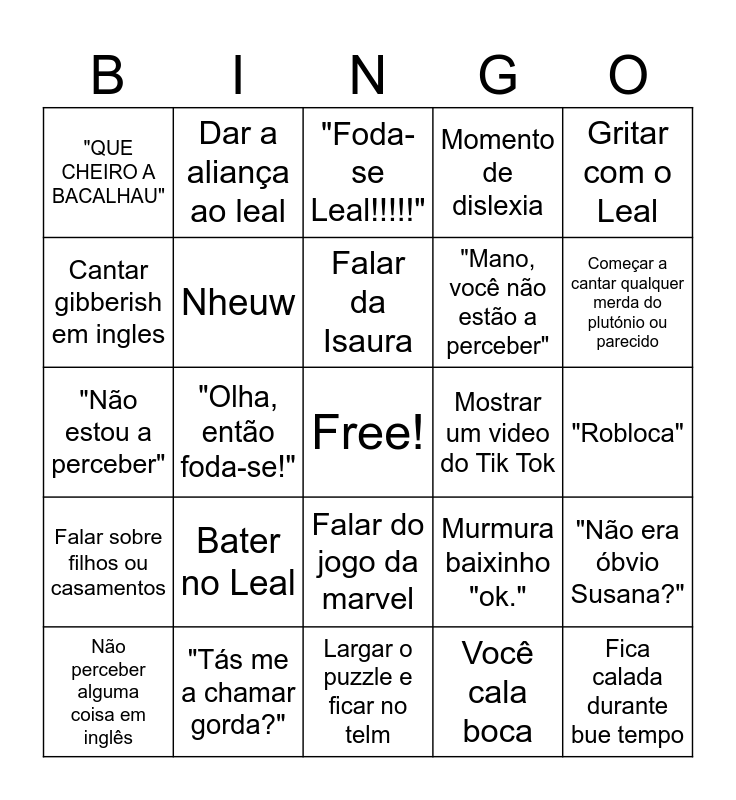 This bingo card has a free space and 24 words: Bater no Leal, "Tás me a chamar gorda?", Falar da Isaura, Não perceber alguma coisa em inglês, Gritar com o Leal, "QUE CHEIRO A BACALHAU", Cantar gibberish em ingles, Dar a aliança ao leal, Mostrar um video do Tik Tok, Falar do jogo da marvel, "Mano, você não estão a perceber", "Não estou a perceber", Murmura baixinho "ok.", "Não era óbvio Susana?", Nheuw, Você cala boca, "Robloca", "Foda-se Leal!!!!!", Começar a cantar qualquer merda do plutónio ou parecido, "Olha, então foda-se!", Fica calada durante bue tempo, Falar sobre filhos ou casamentos, Momento de dislexia and Largar o puzzle e ficar no telm.