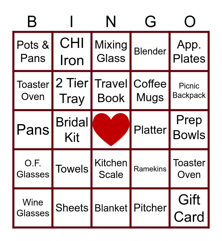 This bingo card has a free space and 24 words: Towels, Sheets, Travel Book, Wine Glasses, App. Plates, Pots & Pans, Toaster Oven, CHI Iron, Platter, Kitchen Scale, Coffee Mugs, Pans, Ramekins, Toaster Oven, 2 Tier Tray, Pitcher, Prep Bowls, Mixing Glass, Picnic Backpack, Bridal Kit, Gift Card, O.F. Glasses, Blender and Blanket.