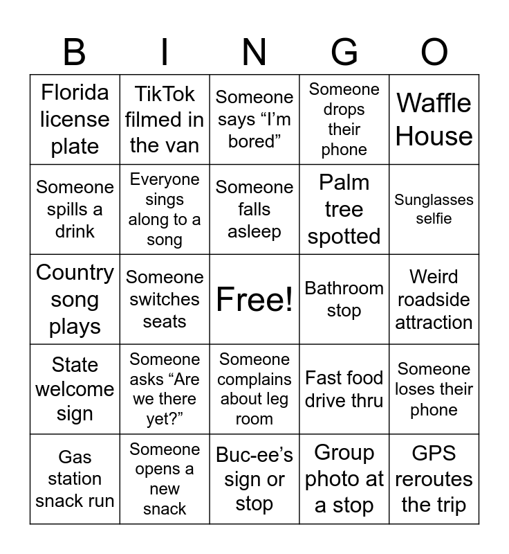 This bingo card has a free space and 25 words: Someone asks “Are we there yet?”, Buc-ee’s sign or stop, Someone falls asleep, Gas station snack run, Waffle House, Florida license plate, Someone spills a drink, TikTok filmed in the van, Bathroom stop, Someone complains about leg room, Palm tree spotted, Country song plays, Fast food drive thru, Someone loses their phone, Everyone sings along to a song, Road construction, Weird roadside attraction, Someone says “I’m bored”, Sunglasses selfie, Someone switches seats, GPS reroutes the trip, Someone opens a new snack, State welcome sign, Someone drops their phone and Group photo at a stop.