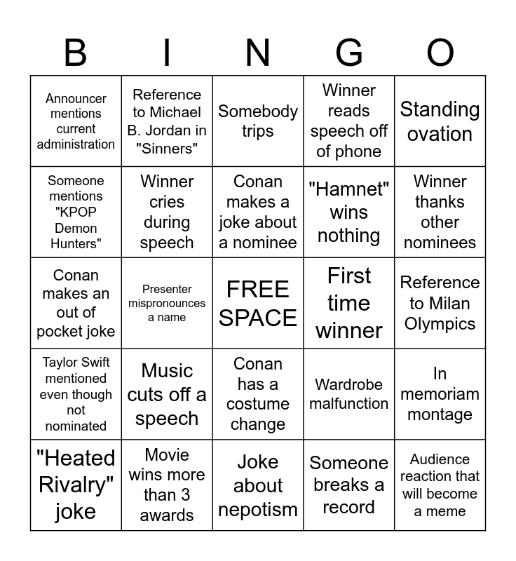This bingo card has a free space and 24 words: Music cuts off a speech, Movie wins more than 3 awards, Conan makes a joke about a nominee, "Heated Rivalry" joke, Standing ovation, Announcer mentions current administration, Someone mentions "KPOP Demon Hunters", Reference to Michael B. Jordan in "Sinners", First time winner, Conan has a costume change, "Hamnet" wins nothing, Conan makes an out of pocket joke, Wardrobe malfunction, In memoriam montage, Winner cries during speech, Someone breaks a record, Reference to Milan Olympics, Somebody trips, Winner thanks other nominees, Presenter mispronounces a name, Audience reaction that will become a meme, Taylor Swift mentioned even though not nominated, Winner reads speech off of phone and Joke about nepotism.