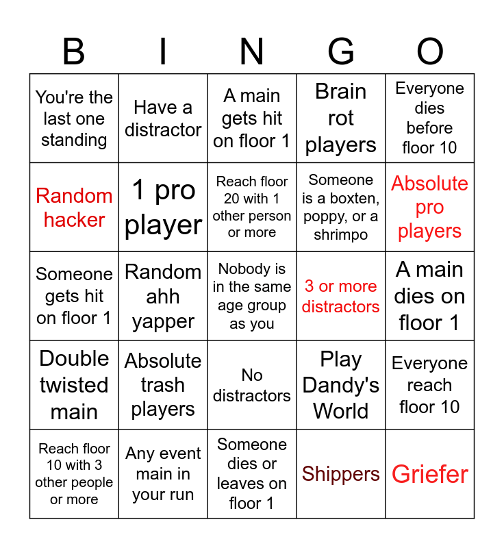 This bingo card has 25 words: Absolute trash players, Someone dies or leaves on floor 1, Reach floor 20 with 1 other person or more, Reach floor 10 with 3 other people or more, Everyone dies before floor 10, You're the last one standing, Random hacker, Have a distractor, 3 or more distractors, No distractors, Someone is a boxten, poppy, or a shrimpo, Someone gets hit on floor 1, Play Dandy's World, Everyone reach floor 10, 1 pro player, Griefer, A main dies on floor 1, A main gets hit on floor 1, Absolute pro players, Random ahh yapper, Nobody is in the same age group as you, Any event main in your run, Double twisted main, Brain rot players and Shippers.