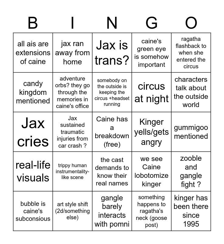 This bingo card has a free space and 32 words: something happens to ragatha's neck (goose post), Jax gloats that he was right about his archetype theory, Jax sustained traumatic injuries from car crash ?, zooble's dysphoria worsens, real-life visuals, adventure orbs? they go through the memories in caine's office, ragatha flashback to when she entered the circus, zooble and gangle fight ?, jax ran away from home, Jax is caine's new favorite, somebody on the outside is keeping the circus +headset running, Jax is trans?, gangle confronts jax, Caine gives Jax a reward, Kinger yells/gets angry, nobody in the main cast abstracts, bubble is caine's subconsious, Jax cries, the cast demands to know their real names, trippy human instrumentality-like scene, we see Caine lobotomize kinger, pomni cries?, gummigoo mentioned, art style shift (2d/something else), kinger has been there since 1995, caine's green eye is somehow important, circus at night, candy kingdom mentioned, all ais are extensions of caine, gangle barely interacts with pomni, in-show reference to 2017 and characters talk about the outside world.