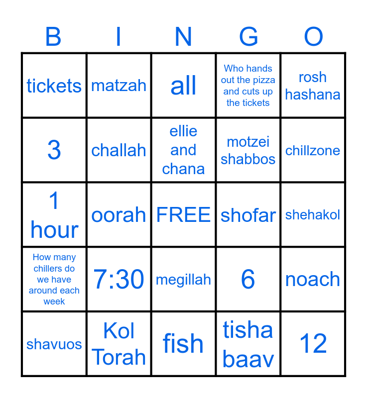This bingo card has a free space and 24 words: 7:30, Kol Torah, ellie and chana, shavuos, rosh hashana, tickets, 3, matzah, shofar, megillah, motzei shabbos, 1 hour, 6, noach, challah, tisha baav, shehakol, all, chillzone, oorah, 12, How many chillers do we have around each week, Who hands out the pizza and cuts up the tickets and fish.