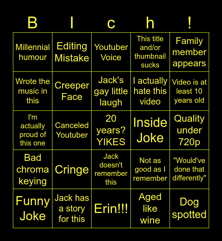 This bingo card has a free space and 29 words: Funny Joke, That aged poorly, Canceled Youtuber, Old, dated reference, Millennial humour, Youtuber Voice, Creeper Face, Cringe, Inside Joke, Jack has a story for this, Quality under 720p, Dog spotted, Erin!!!, Aged like wine, Video is at least 10 years old, Retired Youtuber appears, Jack doesn't remember this, Bad chroma keying, Family member appears, I'm actually proud of this one, Not as good as I remember, Clones, I actually hate this video, Wrote the music in this, This title and/or thumbnail sucks, Editing Mistake, "Would've done that differently", Jack's gay little laugh and "I still have that!".