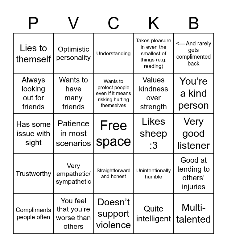 This bingo card has a free space and 24 words: Very empathetic/ sympathetic, You feel that you’re worse than others, Wants to protect people even if it means risking hurting themselves, Compliments people often, <— And rarely gets complimented back, Lies to themself, Always looking out for friends, Optimistic personality, Likes sheep :3, Straightforward and honest, Values kindness over strength, Has some issue with sight, Unintentionally humble, Good at tending to others’ injuries, Wants to have many friends, Quite intelligent, Very good listener, Understanding, You’re a kind person, Patience in most scenarios, Multi-talented, Trustworthy, Takes pleasure in even the smallest of things (e.g: reading) and Doesn’t support violence.