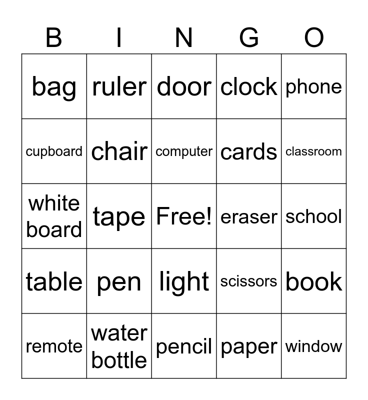 This bingo card has a free space and 24 words: pen, water bottle, computer, remote, phone, bag, cupboard, ruler, eraser, light, cards, white board, scissors, book, chair, paper, school, door, classroom, tape, window, table, clock and pencil.