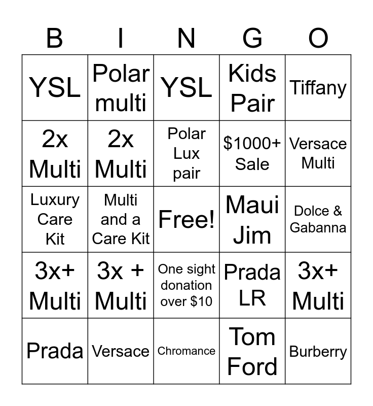 This bingo card has a free space and 24 words: 3x + Multi, Versace, Polar Lux pair, Prada, Tiffany, YSL, 2x Multi, Polar multi, Maui Jim, One sight donation over $10, $1000+ Sale, Luxury Care Kit, Prada LR, 3x+ Multi, 2x Multi, Tom Ford, Dolce & Gabanna, YSL, Versace Multi, Multi and a Care Kit, Burberry, 3x+ Multi, Kids Pair and Chromance.