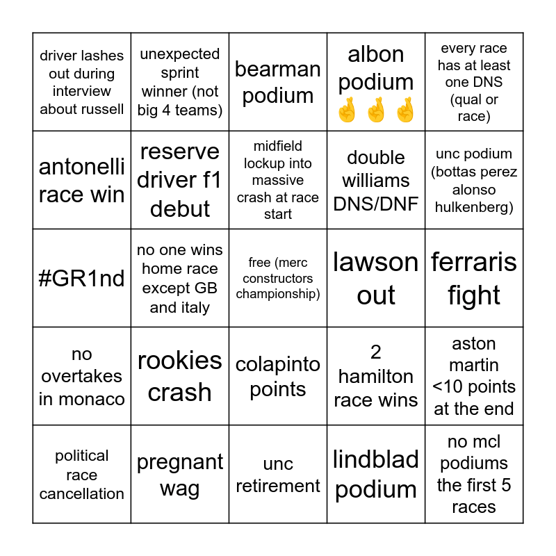 This bingo card has a free space and 24 words: rookies crash, pregnant wag, midfield lockup into massive crash at race start, political race cancellation, every race has at least one DNS (qual or race), driver lashes out during interview about russell, antonelli race win, unexpected sprint winner (not big 4 teams), lawson out, colapinto points, double williams DNS/DNF, #GR1nd, 2 hamilton race wins, aston martin <10 points at the end, reserve driver f1 debut, lindblad podium, ferraris fight, bearman podium, unc podium (bottas perez alonso hulkenberg), no one wins home race except GB and italy, no mcl podiums the first 5 races, no overtakes in monaco, albon podium 🤞🤞🤞 and unc retirement.