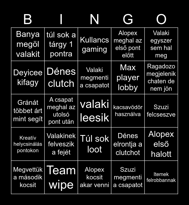 This bingo card has a free space and 24 words: Valakinek felveszik a fejét, Team wipe, Valaki megmenti a csapatot, Megvettük a második kocsit, Valaki egyszer sem hal meg, Banya megöl valakit, Deyicee kifagy, túl sok a tárgy 1 pontra, kacsavödör használva, Túl sok loot, Max player lobby, Gránát többet árt mint segít, Dénes elrontja a clutchot, Alopex első halott, Dénes clutch, Szuzi megmenti a csapatot, Szuzi felcseszve, Kullancs gaming, Ragadozo megjelenik chaten de nem jön, A csapat meghal az utolsó pont után, Itemek felrobbannak, Kreatív helycsinálás pontokon, Alopex meghal az első pont előtt and Alopex kocsit akar venni.