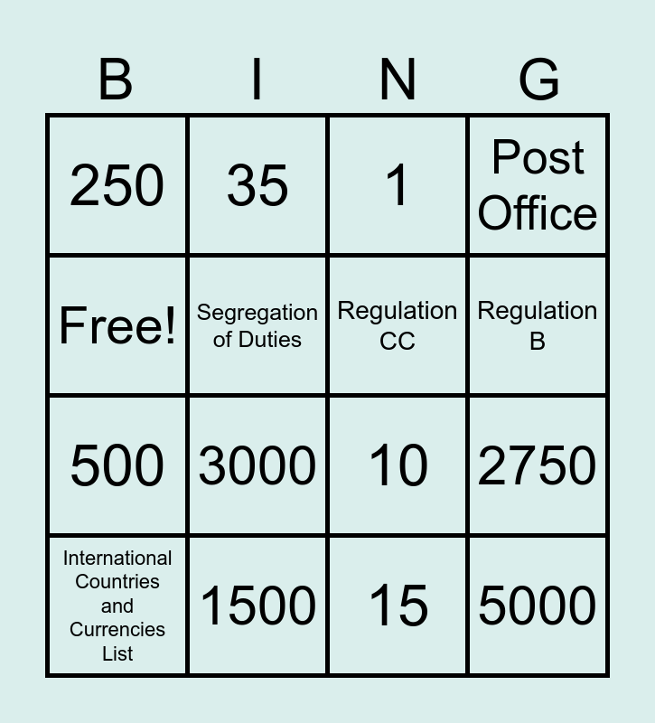 This bingo card has 16 words: 1500, 2750, 1, 250, 500, 35, 10, 15, Free!, Segregation of Duties, International Countries and Currencies List, Post Office, 3000, Regulation B, Regulation CC and 5000.