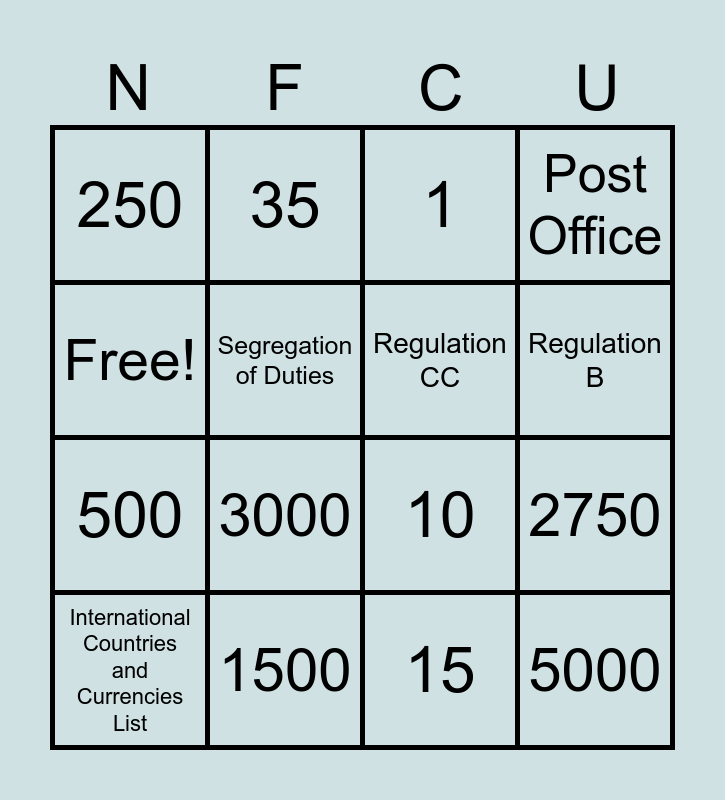 This bingo card has 16 words: 1500, 2750, 1, 250, 500, 35, 10, 15, Free!, Segregation of Duties, International Countries and Currencies List, Post Office, 3000, Regulation B, Regulation CC and 5000.