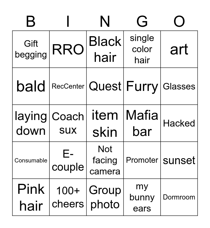 This bingo card has a free space and 24 words: E-couple, 100+ cheers, Quest, Pink hair, art, Gift begging, bald, RRO, Mafia bar, Not facing camera, Furry, laying down, Promoter, sunset, RecCenter, my bunny ears, Hacked, Black hair, Glasses, Coach sux, Dormroom, Consumable, single color hair and Group photo.