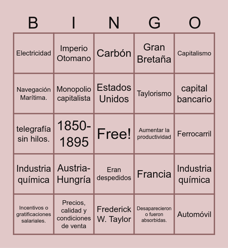 This bingo card has a free space and 24 words: Austria-Hungría, Precios, calidad y condiciones de venta, Estados Unidos, Incentivos o gratificaciones salariales., Capitalismo, Electricidad, Navegación Marítima., Imperio Otomano, Aumentar la productividad, Eran despedidos, Taylorismo, telegrafía sin hilos., Francia, Industria química, Monopolio capitalista, Desaparecieron o fueron absorbidas., Ferrocarril, Carbón, capital bancario, 1850-1895, Automóvil, Industria química, Gran Bretaña and Frederick W. Taylor.