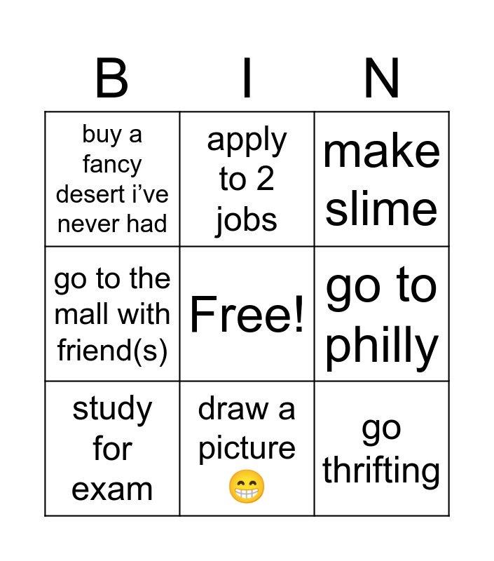 This bingo card has a free space and 8 words: go to philly, make slime, apply to 2 jobs, study for exam, buy a fancy desert i’ve never had, go thrifting, go to the mall with friend(s) and draw a picture 😁.