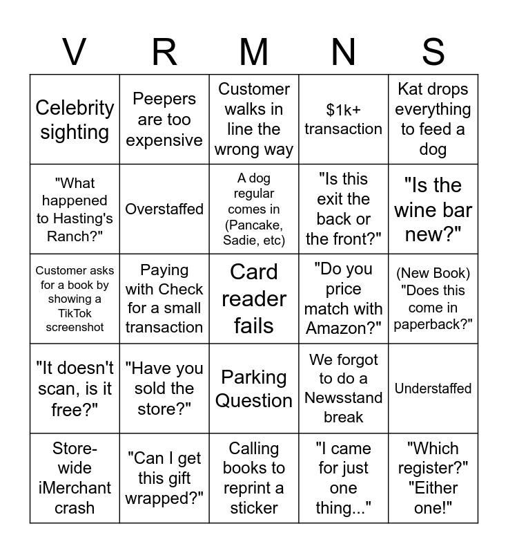 This bingo card has a free space and 24 words: "Have you sold the store?", "Can I get this gift wrapped?", A dog regular comes in (Pancake, Sadie, etc), Store-wide iMerchant crash, Kat drops everything to feed a dog, Celebrity sighting, "What happened to Hasting's Ranch?", Peepers are too expensive, "Do you price match with Amazon?", Parking Question, "Is this exit the back or the front?", Customer asks for a book by showing a TikTok screenshot, We forgot to do a Newsstand break, Understaffed, Overstaffed, "I came for just one thing...", (New Book) "Does this come in paperback?", Customer walks in line the wrong way, "Is the wine bar new?", Paying with Check for a small transaction, "Which register?" "Either one!", "It doesn't scan, is it free?", $1k+ transaction and Calling books to reprint a sticker.