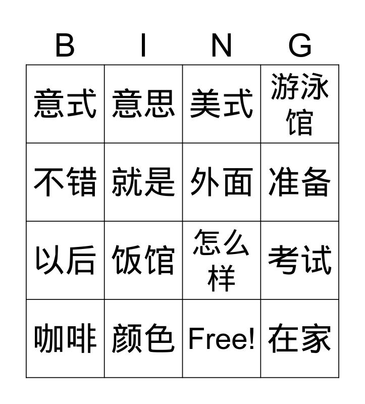This bingo card has 17 words: Free!, 咖啡, 美式, 意式, 饭馆, 游泳馆, 考试, 外面, 准备, 就是, 颜色, 怎么样, 不错, 意思, 以后, 少喝 and 在家.