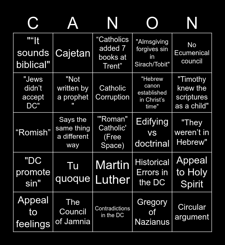 This bingo card has a free space and 54 words: "Blood of Abel to Zechariah", "DC promote sin", Viewed as Protestant vs. Catholic, "Jews didn’t use DC", Martin Luther, "The OT proves itself", "Almsgiving forgives sin in Sirach/Tobit", 400/500 years of silence, "Jews didn’t accept DC", Council of Trent/1546, "“It sounds biblical", "Tobit dark magic", The Council of Jamnia, Appeal to feelings, "Oracles of God", Contradictions in the DC, Circular argument, "Hebrew canon established in Christ’s time", “Let no one add”, "They weren’t in Hebrew", Historical Errors in the DC, Confusion between Apoc/DC, Edifying vs doctrinal, No Ecumenical council, Origen, Cajetan, Athanasius, Jerome, Gregory the Great, Gregory of Nazianus, Cyril of Jerusalem, Melito of Sardis, Philo of Alexandria, Josephus, “Catholics added 7 books at Trent”, “DC was never quoted”, “Romish”, Appeal to Holy Spirit, "Marks of Inspiration", "Not written by a prophet ", "Contradicts the Gospel", "Doesn’t say anything new", Goes off topic, Begins preaching, Tu quoque, Appeal to Sola Scriptura, Avoids actual arguments, "All the Law and the Prophets", Catholic Corruption, Says the same thing a different way, "Timothy knew the scriptures as a child", Espouses an anti-Catholic conspiracy, Orthodox Churches don't matter and Pharisees were right.