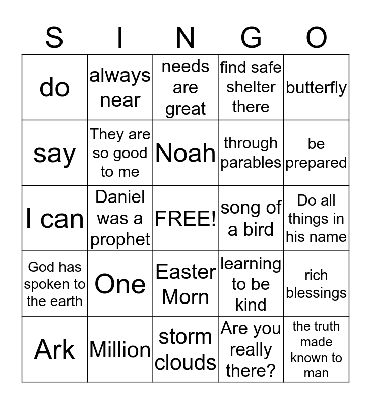 This bingo card has a free space and 24 words: One, Million, Noah, Ark, butterfly, do, say, always near, song of a bird, Easter Morn, through parables, I can, learning to be kind, rich blessings, They are so good to me, Are you really there?, Do all things in his name, needs are great, be prepared, Daniel was a prophet, the truth made known to man, God has spoken to the earth, find safe shelter there and storm clouds.