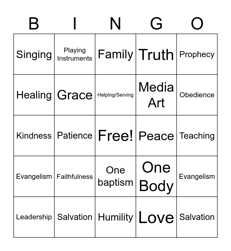 ⚠ This card has duplicate items: Body of Christ (2), Church (2), Believers (2), Family (2), Unity (2), Fellowship (2), Disciples (2), Purpose (4), One Body (2), One Spirit (2), One hope (2), One Lord (2), One faith (2), One baptism (2), One God (2), Singing (2), Playing Instruments (2), Wisdom (2), Discernment (2), Knowledge (2), Giving (3), Prophecy (2), Ministry (3), Mercy (3), Preaching (3), Evangelism (3), Helping/Serving (2), Media Art (2), Healing (2), Tongues and Interpretation (2), Humility (2), Love (2), Grace (2), Forgiveness (2), Patience (2), Kindness (2), Peace (2), Calling (2), Faithfulness (2), Growth (2), Obedience (2), Truth (2), Salvation (2)