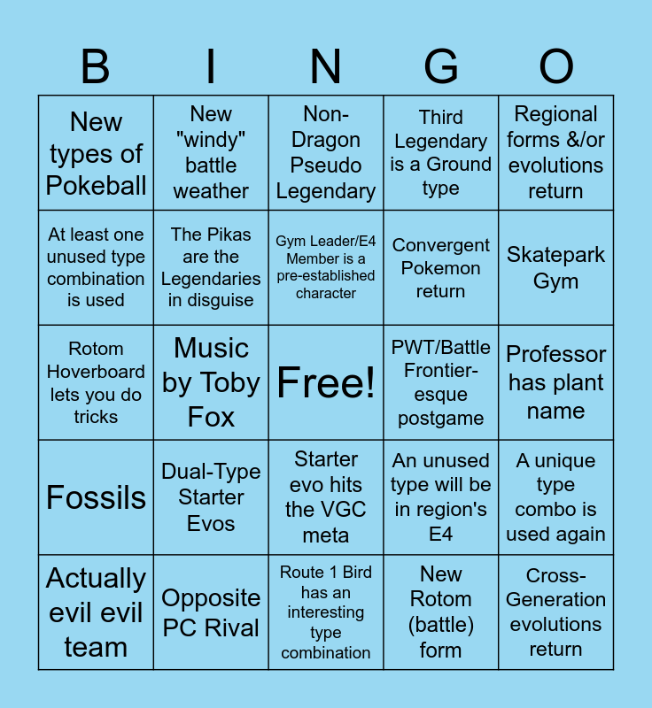 This bingo card has a free space and 24 words: Dual-Type Starter Evos, Opposite PC Rival, Gym Leader/E4 Member is a pre-established character, Actually evil evil team, Regional forms &/or evolutions return, New types of Pokeball, At least one unused type combination is used, New "windy" battle weather, PWT/Battle Frontier-esque postgame, Starter evo hits the VGC meta, Convergent Pokemon return, Rotom Hoverboard lets you do tricks, An unused type will be in region's E4, A unique type combo is used again, The Pikas are the Legendaries in disguise, New Rotom (battle) form, Professor has plant name, Non-Dragon Pseudo Legendary, Skatepark Gym, Music by Toby Fox, Cross-Generation evolutions return, Fossils, Third Legendary is a Ground type and Route 1 Bird has an interesting type combination.