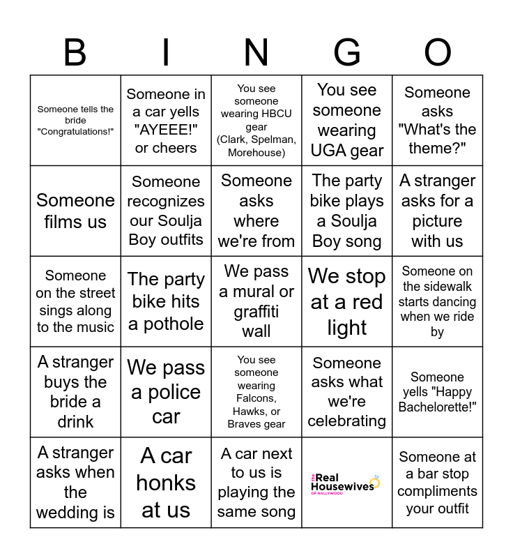 This bingo card has 1 images and 29 words: A car honks at us, Someone's hat or sunglasses almost fly off, The party bike hits a pothole, The whole bike sings a chorus together, Someone tells the bride "Congratulations!", You see someone wearing HBCU gear (Clark, Spelman, Morehouse), Someone recognizes our Soulja Boy outfits, You see someone wearing Falcons, Hawks, or Braves gear, We stop at a red light, A car next to us is playing the same song, Someone on the sidewalk starts dancing when we ride by, We pass a mural or graffiti wall, Someone at a bar stop compliments your outfit, A stranger asks for a picture with us, We pass a rooftop bar, Someone asks what we're celebrating, A stranger buys the bride a drink, We pass a police car, Someone asks "What's the theme?", Someone on the street sings along to the music, A MARTA bass passes us, Someone in a car yells "AYEEE!" or cheers, The party bike plays a Soulja Boy song, Someone films us, You see someone wearing UGA gear, Someone yells "Happy Bachelorette!", A stranger asks when the wedding is, Someone asks where we're from and Someone buys the bride a shot.
