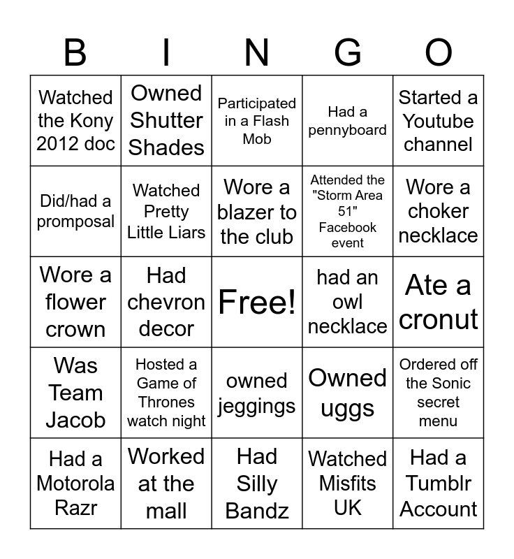 This bingo card has a free space and 44 words: Named their first car, Had a Tumblr Account, Played High School Sports, Had a Motorola Razr, Saw Childish Gambino in Concert, Watched Misfits UK, Participated in a Flash Mob, Did the cinnamon challenge, Started a Youtube channel, Worked at the mall, Had a pennyboard, had an owl necklace, owned jeggings, Hosted a Game of Thrones watch night, Ghosted someone, Had Silly Bandz, Thought "the dress" was Blue/Black, Wore a flower crown, Owned a pair of Toms shoes, Wore a choker necklace, Owned Shutter Shades, Bought a Kylie Lip Kit, Sang Wagon Wheel, Watched the Kony 2012 doc, Had a "sweet 16", Ate a cronut, Read "The Fault in Our Stars", Did a senior prank, Owned uggs, Was Team Jacob, Wore a flower crown, Ordered off the Sonic secret menu, Had facebook drama, Used chat roulette, Had chevron decor, Subtweeted someone, Used the VSCO app, Played farmville, Wore a blazer to the club, Did/had a promposal, Attended the "Storm Area 51" Facebook event, Wore Sperry shoes, Watched Pretty Little Liars and Planked.