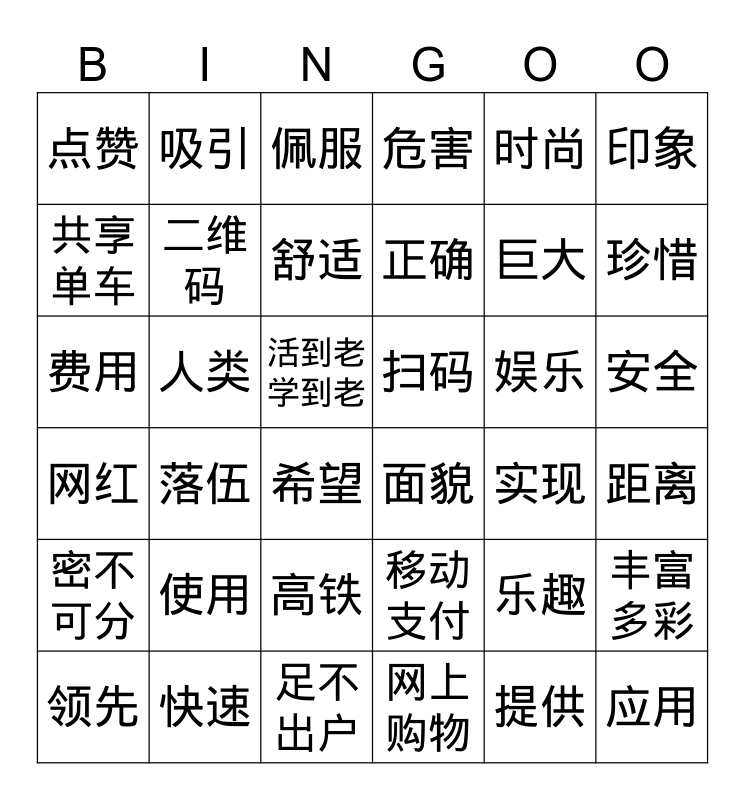 This bingo card has 36 words: 移动支付, 高铁, 网上购物, 共享单车, 网红, 扫码, 二维码, 足不出户, 时尚, 乐趣, 珍惜, 危害, 丰富多彩, 人类, 正确, 点赞, 密不可分, 娱乐, 费用, 佩服, 活到老学到老, 落伍, 面貌, 希望, 实现, 吸引, 巨大, 快速, 舒适, 印象, 应用, 领先, 距离, 安全, 使用 and 提供.