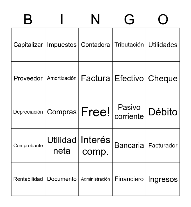 This bingo card has a free space and 75 words: Contabilidad, Contador, Contadora, Auditoría, Auditor, Balance, Activos, Pasivos, Capital, Patrimonio, Inventario, Facturación, Factura, Proveedor, Cliente, Compras, Ventas, Ingresos, Gastos, Utilidades, Pérdidas, Depreciación, Amortización, Impuestos, Tributación, Hacienda, Retención, Liquidación, Registro, Asiento, Libro diario, Libro mayor, Conciliación, Bancaria, Cheque, Efectivo, Transferencia, Crédito, Débito, Financiero, Presupuesto, Costeo, Producción, Distribución, Operaciones, Inversión, Rentabilidad, Capitalizar, Descuento, Intereses, Interés simple, Interés comp., Valor futuro, Valor presente, Flujo efectivo, Periodo, Tasa interés, Costo fijo, Costo variable, Margen bruto, Utilidad neta, Utilidad bruta, Patrimonio neto, Activo fijo, Activo corriente, Pasivo corriente, Pasivo largo, Declaración, Contribuyente, Facturador, Comprobante, Documento, Contabilizar, Administración and Financiamiento.