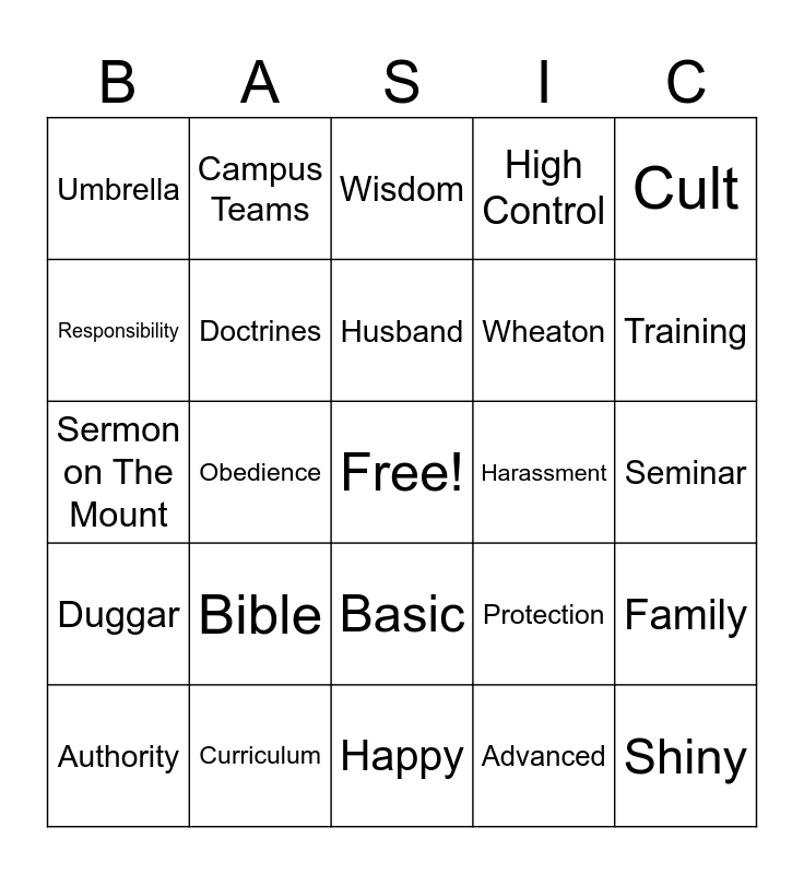 This bingo card has a free space and 29 words: Authority, Principles, Obedience, Bill, Umbrella, Wisdom, Doctrines, Bible, Harassment, Curriculum, Seminar, Shiny, Happy, Advanced, Training, Institute, Basic, Duggar, Cult, Sermon on The Mount, Protection, Christ, Wheaton, Responsibility, High Control, Campus Teams, Family, Husband and Gender Roles.