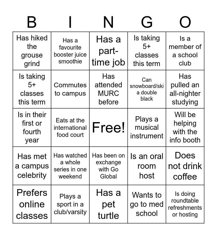 This bingo card has a free space and 24 words: Has watched a whole series in one weekend, Plays a sport in a club/varsity, Has attended MURC before, Prefers online classes, Is a member of a school club, Has hiked the grouse grind, Is taking 5+ classes this term, Has a favourite booster juice smoothie, Plays a musical instrument, Has been on exchange with Go Global, Can snowboard/ski a double black, Is in their first or fourth year, Is an oral room host, Does not drink coffee, Commutes to campus, Wants to go to med school, Will be helping with the info booth, Has a part-time job, Has pulled an all-nighter studying, Eats at the international food court, Is doing roundtable refreshments or hosting, Has met a campus celebrity, Is taking 5+ classes this term and Has a pet turtle.