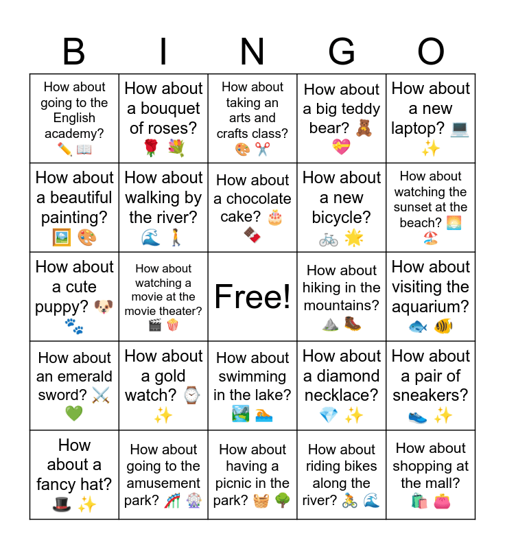 This bingo card has a free space and 30 words: How about going to the amusement park? ๐ข ๐ก, How about going to the museum? ๐๏ธ ๐ผ๏ธ, How about watching a movie at the movie theater? ๐ฌ ๐ฟ, How about studying at the library? ๐ ๐ค, How about going to the English academy? โ๏ธ ๐, How about taking an arts and crafts class? ๐จ โ๏ธ, How about walking by the river? ๐ ๐ถ, How about swimming in the lake? ๐๏ธ ๐, How about hiking in the mountains? โฐ๏ธ ๐ฅพ, How about having a picnic in the park? ๐งบ ๐ณ, How about visiting the aquarium? ๐ ๐ , How about shopping at the mall? ๐๏ธ ๐, How about riding bikes along the river? ๐ด ๐, How about playing soccer in the park? โฝ ๐ณ, How about watching the sunset at the beach? ๐ ๐๏ธ, How about a Chanel bag? ๐ โจ, How about a diamond necklace? ๐ โจ, How about an emerald sword? โ๏ธ ๐, How about a gold watch? โ โจ, How about a new laptop? ๐ป โจ, How about a cute puppy? ๐ถ ๐พ, How about a box of chocolates? ๐ซ ๐, How about a bouquet of roses? ๐น ๐, How about a new bicycle? ๐ฒ ๐, How about a beautiful painting? ๐ผ๏ธ ๐จ, How about a big teddy bear? ๐งธ ๐, How about a pair of sneakers? ๐ โจ, How about a fancy hat? ๐ฉ โจ, How about a chocolate cake? ๐ ๐ซ and How about a new phone? ๐ฑ โจ.