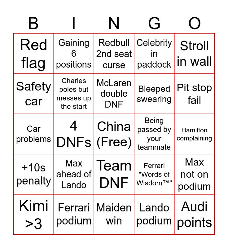 This bingo card has a free space and 24 words: Max ahead of Lando, Ferrari podium, McLaren double DNF, Kimi >3, Stroll in wall, Red flag, Safety car, Gaining 6 positions, Being passed by your teammate, Team DNF, Bleeped swearing, Car problems, Ferrari "Words of Wisdom™", Max not on podium, Charles poles but messes up the start, Lando podium, Hamilton complaining, Redbull 2nd seat curse, Pit stop fail, 4 DNFs, Audi points, +10s penalty, Celebrity in paddock and Maiden win.