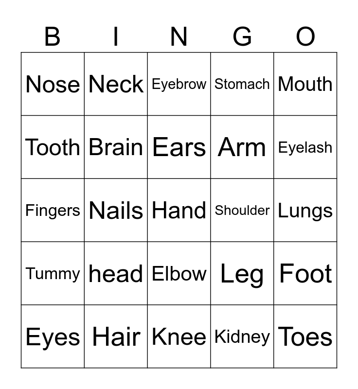 This bingo card has a free space and 24 words: head, Hair, Ears, Eyes, Mouth, Nose, Tooth, Neck, Shoulder, Elbow, Arm, Fingers, Leg, Foot, Brain, Kidney, Lungs, Eyebrow, Eyelash, Nails, Toes, Tummy, Stomach and Knee.