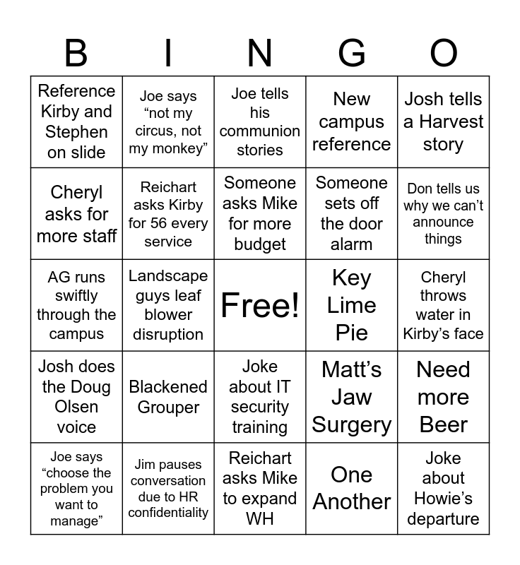 This bingo card has a free space and 24 words: Blackened Grouper, Jim pauses conversation due to HR confidentiality, Someone asks Mike for more budget, Joe says “choose the problem you want to manage”, Josh tells a Harvest story, Reference Kirby and Stephen on slide, Cheryl asks for more staff, Joe says “not my circus, not my monkey”, Key Lime Pie, Joke about IT security training, Someone sets off the door alarm, AG runs swiftly through the campus, Matt’s Jaw Surgery, Need more Beer, Reichart asks Kirby for 56 every service, One Another, Cheryl throws water in Kirby’s face, Joe tells his communion stories, Don tells us why we can’t announce things, Landscape guys leaf blower disruption, Joke about Howie’s departure, Josh does the Doug Olsen voice, New campus reference and Reichart asks Mike to expand WH.