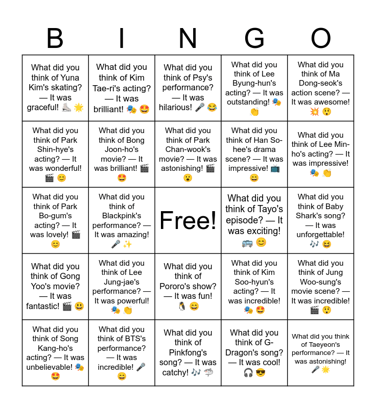 This bingo card has a free space and 30 words: What did you think of BTS's performance? — It was incredible! 🎤 😄, What did you think of IU's song? — It was beautiful! 🎶 😊, What did you think of Blackpink's performance? — It was amazing! 🎤 ✨, What did you think of Son Heung-min's goal? — It was unbelievable! ⚽ 😲, What did you think of Yuna Kim's skating? — It was graceful! ⛸️ 🌟, What did you think of Psy's performance? — It was hilarious! 🎤 😂, What did you think of Bong Joon-ho's movie? — It was brilliant! 🎬 🤩, What did you think of Pororo's show? — It was fun! 🐧 😄, What did you think of Tayo's episode? — It was exciting! 🚌 😊, What did you think of Pinkfong's song? — It was catchy! 🎶 🦈, What did you think of Baby Shark's song? — It was unforgettable! 🎶 😆, What did you think of Taeyeon's performance? — It was astonishing! 🎤 🌟, What did you think of G-Dragon's song? — It was cool! 🎧 😎, What did you think of Suzy's drama scene? — It was wonderful! 📺 😊, What did you think of Lee Min-ho's acting? — It was impressive! 🎭 👏, What did you think of Park Seo-joon's acting? — It was excellent! 🎬 😄, What did you think of Kim Soo-hyun's acting? — It was incredible! 🎭 🤩, What did you think of Gong Yoo's movie? — It was fantastic! 🎬 😃, What did you think of Lee Jung-jae's performance? — It was powerful! 🎭 👏, What did you think of Ma Dong-seok's action scene? — It was awesome! 💥 😲, What did you think of Park Bo-gum's acting? — It was lovely! 🎬 😊, What did you think of Cha Eun-woo's performance? — It was amazing! 🎤 🌟, What did you think of Kim Tae-ri's acting? — It was brilliant! 🎭 🤩, What did you think of Han So-hee's drama scene? — It was impressive! 📺 😄, What did you think of Park Shin-hye's acting? — It was wonderful! 🎬 😊, What did you think of Lee Byung-hun's acting? — It was outstanding! 🎭 👏, What did you think of Jung Woo-sung's movie scene? — It was incredible! 🎬 😲, What did you think of Song Kang-ho's acting? — It was unbelievable! 🎭 🤩, What did you think of Park Chan-wook's movie? — It was astonishing! 🎬 😮 and What did you think of Jun Ji-hyun's acting? — It was fantastic! 🎭 🌟.