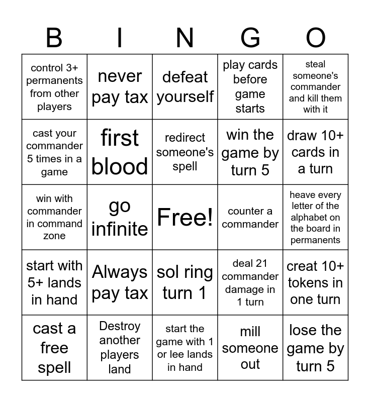This bingo card has a free space and 24 words: Always pay tax, Destroy another players land, redirect someone's spell, cast a free spell, steal someone's commander and kill them with it, control 3+ permanents from other players, cast your commander 5 times in a game, never pay tax, counter a commander, sol ring turn 1, win the game by turn 5, win with commander in command zone, deal 21 commander damage in 1 turn, creat 10+ tokens in one turn, first blood, mill someone out, heave every letter of the alphabet on the board in permanents, defeat yourself, draw 10+ cards in a turn, go infinite, lose the game by turn 5, start with 5+ lands in hand, play cards before game starts and start the game with 1 or lee lands in hand.