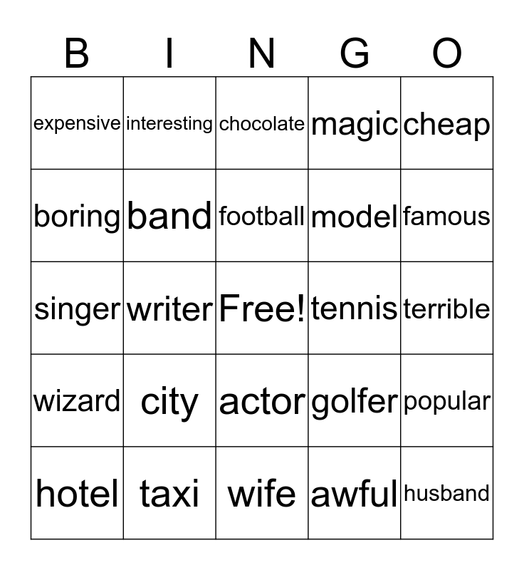 This bingo card has a free space and 24 words: city, taxi, football, hotel, cheap, expensive, boring, interesting, tennis, actor, model, singer, golfer, popular, band, awful, terrible, chocolate, famous, writer, husband, wizard, magic and wife.