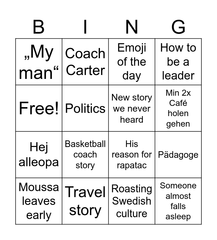 This bingo card has 16 words: Travel story, Pädagoge, Emoji of the day, „My man“, Hej alleopa, Coach Carter, His reason for rapatac, Roasting Swedish culture, Free!, Politics, Moussa leaves early, How to be a leader, Basketball coach story, Min 2x Café holen gehen, New story we never heard and Someone almost falls asleep.