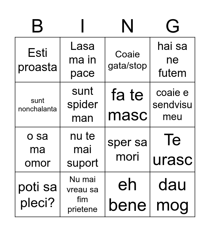 This bingo card has 16 words: Nu mai vreau sa fim prietene, Te urasc, Coaie gata/stop, Esti proasta, o sa ma omor, Lasa ma in pace, sper sa mori, eh bene, sunt nonchalanta, sunt spider man, poti sa pleci?, hai sa ne futem, nu te mai suport, coaie e sendvisu meu, fa te masc and dau mog.