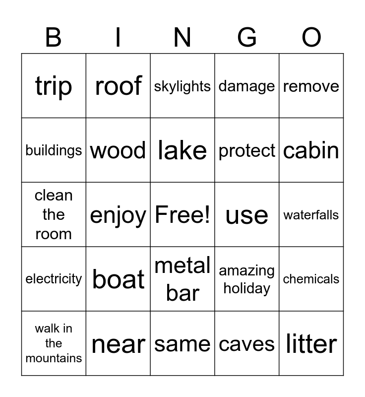 This bingo card has a free space and 27 words: amazing holiday, environment, protect, same, buildings, skylights, roof, electricity, use, chemicals, clean the room, damage, walk in the mountains, near, cabin, mud, wood, lake, boat, trip, waterfalls, caves, enjoy, litter, metal bar, remove and far away.