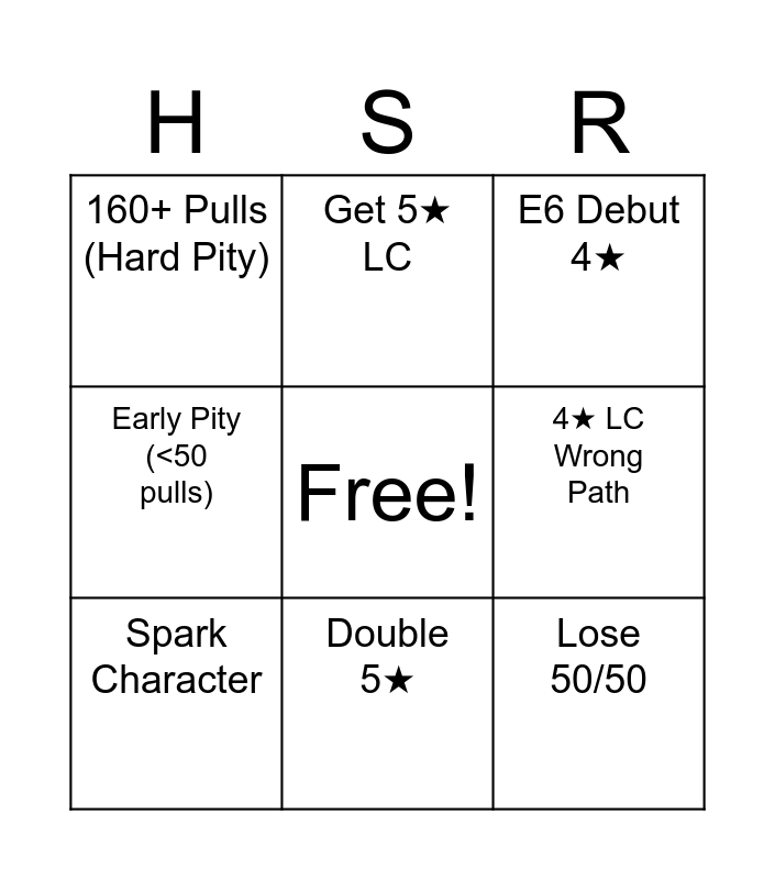 This bingo card has a free space and 8 words: 4★ LC Wrong Path, E6 Debut 4★, Get 5★ LC, Spark Character, 160+ Pulls (Hard Pity), Lose 50/50, Early Pity (<50 pulls) and Double 5★.