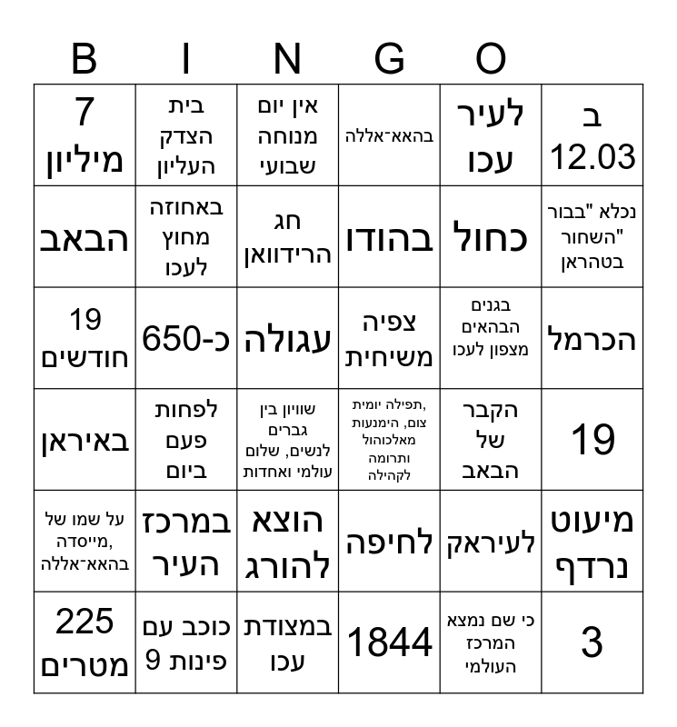This bingo card has 36 words: לחיפה, הוצא להורג, 1844, הבאב, באיראן, צפיה משיחית, באחוזה מחוץ לעכו, במצודת עכו, לעיר עכו, לעיראק, נכלא "בבור השחור" בטהראן, בהאא־אללה, מיעוט נרדף, כ-650, בהודו, 7 מיליון, על שמו של מייסדה, בהאא־אללה, בגנים הבהאים מצפון לעכו, 19 חודשים, אין יום מנוחה שבועי, עגולה, לפחות פעם ביום, תפילה יומית, צום, הימנעות מאלכוהול ותרומה לקהילה, שוויון בין גברים לנשים, שלום עולמי ואחדות, הקבר של הבאב, בית הצדק העליון, כחול, כוכב עם 9 פינות, חג הרידוואן, ב 12.03, 3, 225 מטרים, 19, הכרמל, במרכז העיר and כי שם נמצא המרכז העולמי.