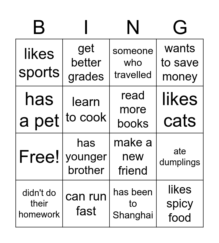 This bingo card has 20 words: ate dumplings, watched an English movie, someone who travelled, someone who ate hotpot, didn't do their homework, has a pet, can run fast, likes sports, Free!, get better grades, has younger brother, make a new friend, learn to cook, likes spicy food, read more books, can play the guitar, likes cats, wants to save money, has been to Shanghai and slept past 10AM.