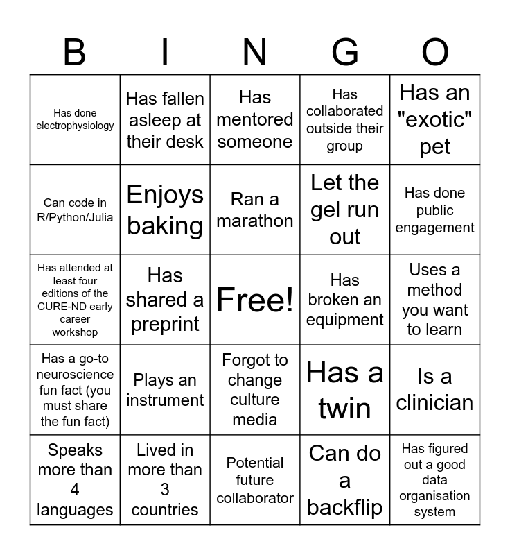 This bingo card has a free space and 24 words: Plays an instrument, Lived in more than 3 countries, Ran a marathon, Speaks more than 4 languages, Has an "exotic" pet, Has done electrophysiology, Can code in R/Python/Julia, Has fallen asleep at their desk, Has broken an equipment, Forgot to change culture media, Let the gel run out, Has attended at least four editions of the CURE-ND early career workshop, Has a twin, Is a clinician, Enjoys baking, Can do a backflip, Uses a method you want to learn, Has mentored someone, Has done public engagement, Has shared a preprint, Has figured out a good data organisation system, Has a go-to neuroscience fun fact (you must share the fun fact), Has collaborated outside their group and Potential future collaborator.
