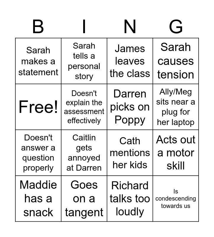 This bingo card has 16 words: Goes on a tangent, Acts out a motor skill, James leaves the class, Sarah makes a statement, Doesn't answer a question properly, Sarah tells a personal story, Cath mentions her kids, Richard talks too loudly, Free!, Doesn't explain the assessment effectively, Maddie has a snack, Sarah causes tension, Caitlin gets annoyed at Darren, Ally/Meg sits near a plug for her laptop, Darren picks on Poppy and Is condescending towards us.