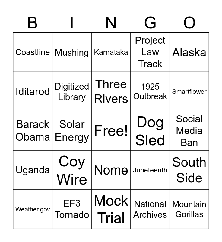 This bingo card has a free space and 24 words: Coy Wire, EF3 Tornado, Three Rivers, Weather.gov, Alaska, Coastline, Iditarod, Mushing, Dog Sled, Nome, 1925 Outbreak, Barack Obama, Juneteenth, South Side, Digitized Library, National Archives, Social Media Ban, Karnataka, Smartflower, Solar Energy, Mountain Gorillas, Uganda, Project Law Track and Mock Trial.