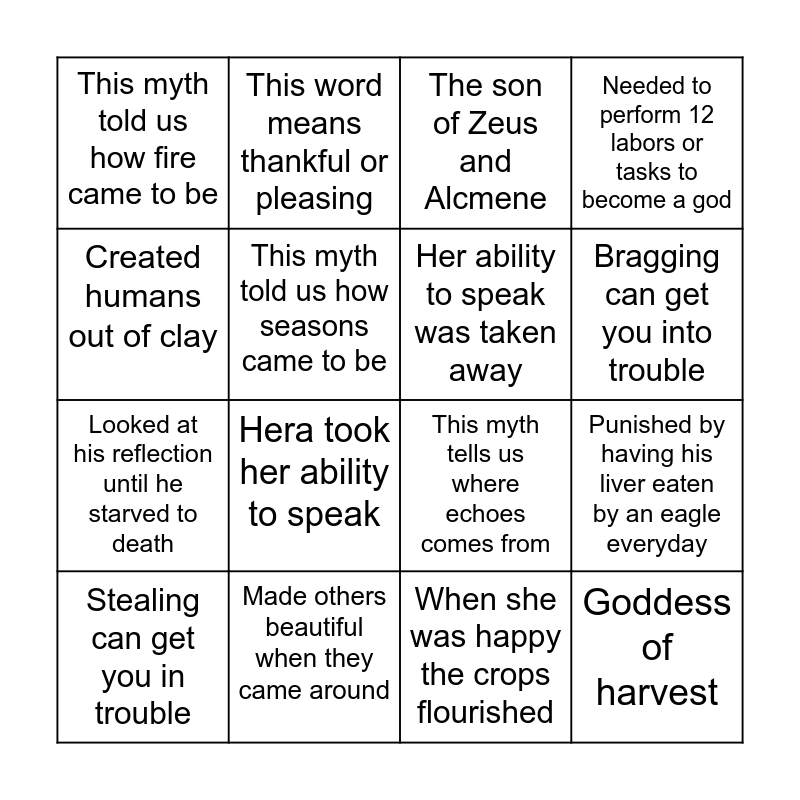 This bingo card has 23 words: Goddess of harvest, Was turned into a spider, Bragging can get you into trouble, Arachnophobia is the fear of spiders, Created humans out of clay, This myth told us how fire came to be, This myth told us how seasons came to be, This word means thankful or pleasing, Stealing can get you in trouble, Tricking others can get you into trouble, Hera took her ability to speak, Looked at his reflection until he starved to death, Had a contest to see who was the best weaver, This myth told us how spiders came to be, Made others beautiful when they came around, Had a daughter named Persephone, that was kidnapped by Hades., The son of Zeus and Alcmene, This myth tells us where echoes comes from, Her ability to speak was taken away, Punished by having his liver eaten by an eagle everyday, Needed to perform 12 labors or tasks to become a god, When she was happy the crops flourished and The repetition of a sound.