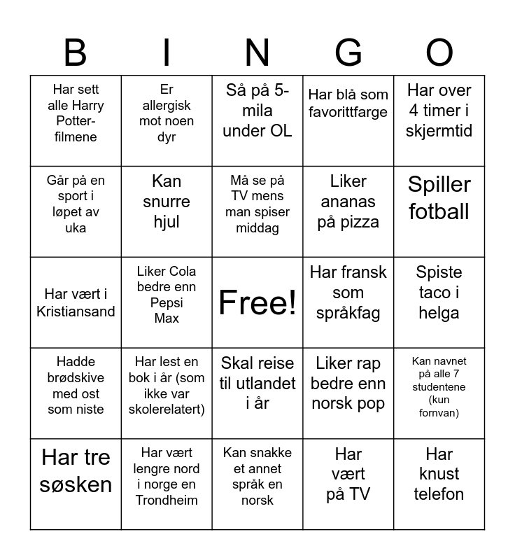 This bingo card has a free space and 29 words: Har tre søsken, Spiller et instrument, Liker Cola bedre enn Pepsi Max, Har en katt, Har sett alle Harry Potter-filmene, Så på 5-mila under OL, Kan snurre hjul, Har lest en bok i år (som ikke var skolerelatert), Har fransk som språkfag, Har vært lengre nord i norge en Trondheim, Spiste taco i helga, Har knust telefon, Kan snakke et annet språk en norsk, Har vært på TV, Spiller fotball, Liker matte bedre enn KRLE, Skal reise til utlandet i år, Hadde brødskive med ost som niste, Har over 4 timer i skjermtid, Har vært i Kristiansand, Liker rap bedre enn norsk pop, Kan nevne 3 låter av The Beatles, Liker ananas på pizza, Går på en sport i løpet av uka, Har blå som favorittfarge, Er allergisk mot noen dyr, Kan navnet på alle 7 studentene (kun fornvan), Må se på TV mens man spiser middag and Kjøpte lunsj i dag.