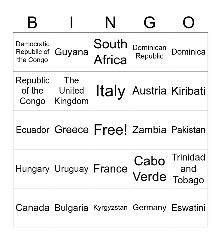 This bingo card has a free space and 196 words: Afghanistan, Albania, Algeria, Andorra, Angola, Antigua and Barbuda, Argentina, Armenia, Australia, Austria, Azerbaijan, The Bahamas, Bahrain, Bangladesh, Barbados, Belarus, Belgium, Belize, Benin (Dahomey), Bolivia, Bosnia and Herzegovina, Botswana, Brazil, Brunei, Bulgaria, Burkina Faso (Upper Volta), Burma, Burundi, Cabo Verde, Cambodia, Cameroon, Canada, The Cayman Islands, Central African Republic, Chad, Chile, China, Colombia, Comoros, Cook Islands, Costa Rica, Cote d’Ivoire (Ivory Coast), Croatia, Cuba, Cyprus, Czechia, Democratic Republic of the Congo, Denmark, Djibouti, Dominica, Dominican Republic, Ecuador, Egypt, El Salvador, Equatorial Guinea, Eritrea, Estonia, Eswatini, Ethiopia, Fiji, Finland, France, Gabon, Gambia, Georgia, Germany, Ghana, Greece, Grenada, Guatemala, Guinea, Guinea-Bissau, Guyana, Haiti, Holy See (Vatican City), Honduras, Hungary, Iceland, India, Indonesia, Iran, Iraq, Ireland, Israel, Italy, Jamaica, Japan, Jordan, Kazakhstan, Kenya, Kiribati, Korea, Kosovo, Kuwait, Kyrgyzstan, Laos, Latvia, Lebanon, Lesotho, Liberia, Libya, Liechtenstein, Lithuania, Luxembourg, Madagascar, Malawi, Malaysia, Maldives, Mali, Malta, Marshall Islands, Mauritania, Mauritius, Mexico, Micronesia, Moldova, Monaco, Mongolia, Montenegro, Morocco, Mozambique, Namibia, Nauru, Nepal, The Netherlands, New Zealand, Nicaragua, Niger, Nigeria, Niue, North Macedonia, Norway, Oman, Pakistan, Palau, Panama, Papua New Guinea, Paraguay, Peru, Philippines, Poland, Portugal, Qatar, Republic of South Korea, Republic of the Congo, Romania, Russia, Rwanda, Saint Kitts and Nevis, Saint Lucia, Saint Vincent and the Grenadines, Samoa, San Marino, Sao Tome and Principe, Saudi Arabia, Senegal, Serbia, Seychelles, Sierra Leone, Singapore, Slovakia, Slovenia, The Solomon Islands, Somalia, South Africa, South Sudan, Spain, Sri Lanka, Sudan, Suriname, Sweden, Switzerland, Syria, Tajikistan, Tanzania, Thailand, Timor-Leste, Togo, Tonga, Trinidad and Tobago, Tunisia, Turkey, Turkmenistan, Tuvalu, Uganda, Ukraine, The United Arab Emirates, The United Kingdom, Uruguay, Uzbekistan, Vanuatu, Venezuela, Vietnam, Yemen, Zambia and Zimbabwe.